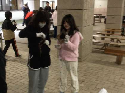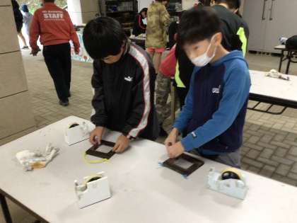 写真入れづくり、金具とひも、写真を入れる透明の袋をつけ、絵を描いて完成です。