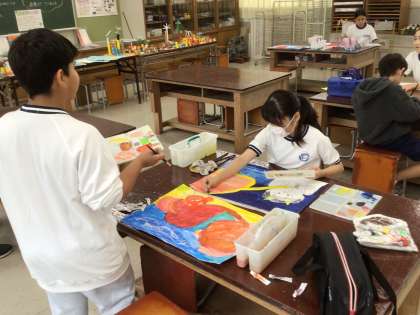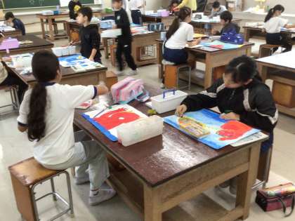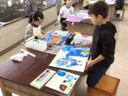 4年2組の図工の様子です。読書感想画が完成に近づきつつあります。クレヨンを使ったり、手で絵具を伸ばしたりするなど、工夫して描いています。