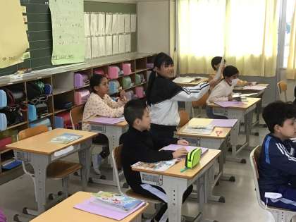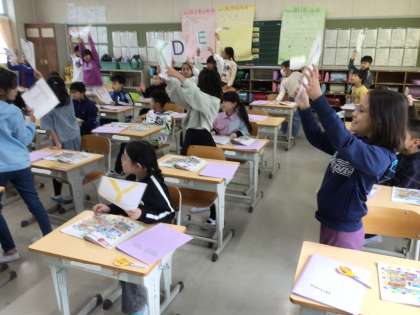 3年生の外国語活動の様子です。「THE ABC SONG」を歌いながら、自分が持っているアルファベットが出てきたら立つという活動を楽しみました。