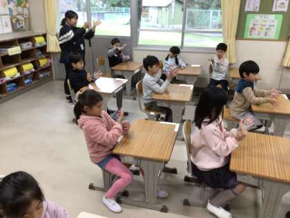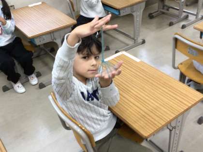 1年生の学活の様子です。あやとりで「ほうき」をつくることに挑戦しました。