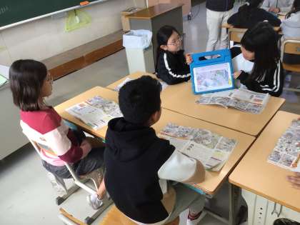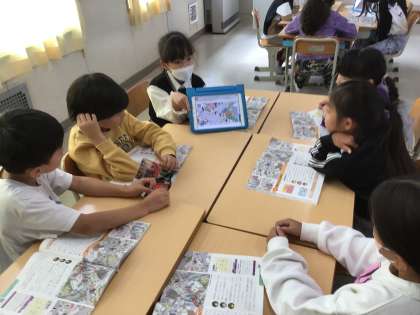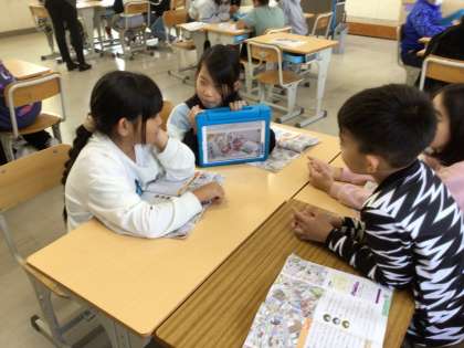 3年生の社会の様子です。『火事からくらしを守る』という学習をしています。絵から見つけた人々の様子をグループで伝え合う活動をしています。