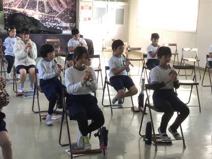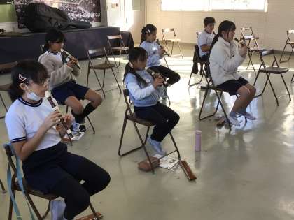 4年1組の音楽の様子です。リコーダーで高い「ミ」、「ファ」、「ソ」の音を演奏するためにサミングを学習しました。みんな、しっかりと高い「ミ」、「ファ」、「ソ」の音を演奏することができていました。