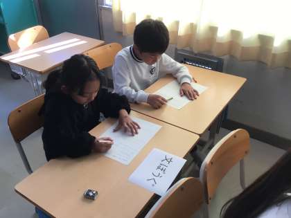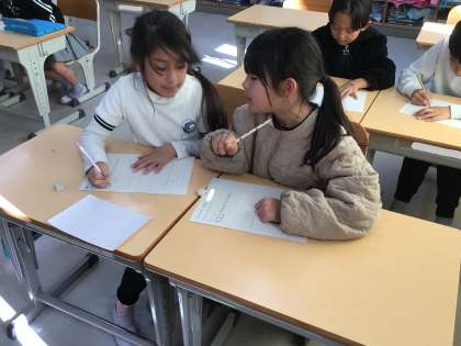 2年生の国語の様子です。ペアでお題カードを引き、お題カードについての「仲間になる言葉」をできるだけ多く探しました。10個以上見つけるグループ、みんながみつけないようなものを書くグループなどがありました。