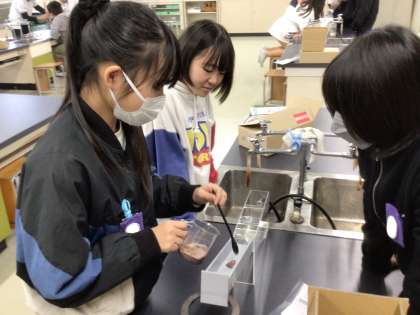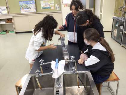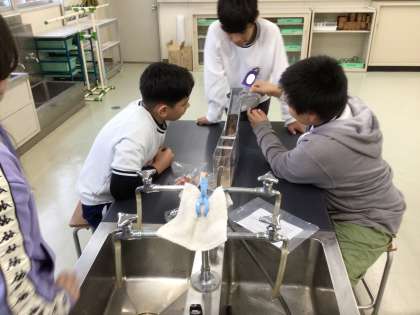 6年1組の理科の様子です。地層がなぜしま模様になるのかを実験で確認しました。粒の大きいものから順に沈んで層となることを学びました。