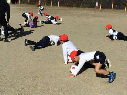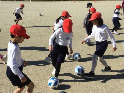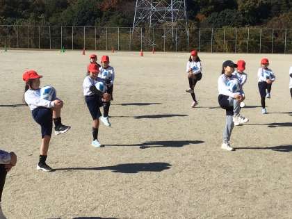 中京大学の大家先生、加藤先生にお越しいただき、3年生でサッカー教室を実施しました。最初のウォーミングアップの様子です。
