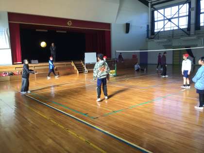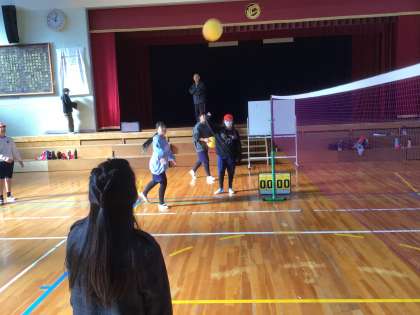 6年生の体育の様子です。3回以内のパスやトスで相手のコートに入れる練習をグループごとにしています。みんなで声をかけ合いながら協力して取り組めています。