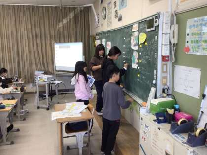 5年生の社会の様子です。移動販売を行うことについて、コンビニエンスストアにとってよいこと、お客さんにとってよいことをそれぞれ考えました。その後、さらにこんなサービスがあるといいなというアイディアも考えました。