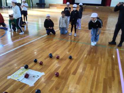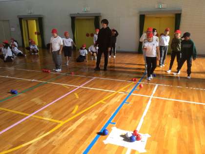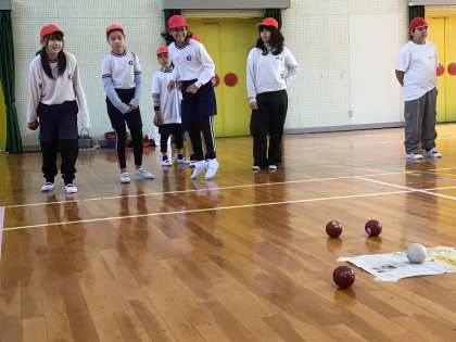体育館に戻り、ボッチャ体験を行いました。簡単なルール説明を受け、チームに分かれて体験しました。最後まで勝負の行方が分からないので、とても盛り上がりました。