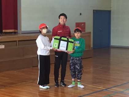 最後に、石田選手への質問をしたり、体験した感想を話したりしました。ボッチャ1セットをいただくとともに、みんなで記念撮影もしました。大変貴重な経験ができました。