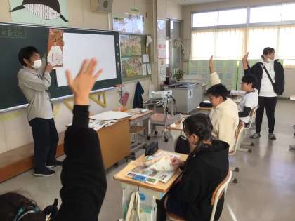 6年1組の社会の様子です。歴史上の人物の肖像画を見て、それが誰なのか、どんなことをした人なのかを答えていきました。これまで学んだことをしっかりと復習できました。