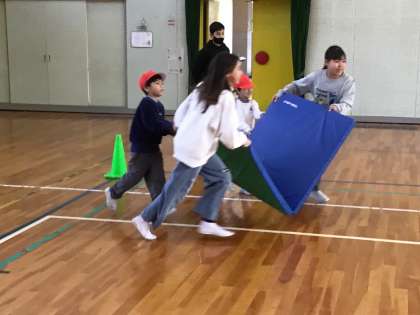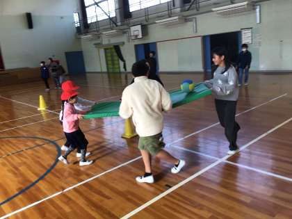 マットにボールをのせ、それを1年生と6年生が運ぶ競技を楽しみました。1年生と6年生が協力して取り組む姿がとても印象的でした。
