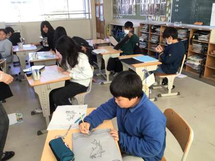5年生の図工の様子です。動きのある版画の下絵を考え、版木に写していく活動をしています。写し終えた子から、どこを彫刻刀で削り、どこを残していくのかを考えています。