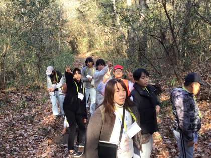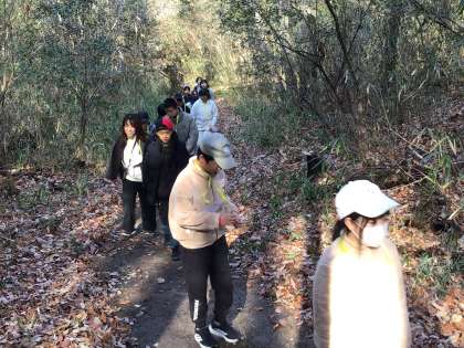 レクリエーション後には、ハローウッズの散策をしました。できるだけ大きなドングリを見つけながら、みんなで散策しました。
