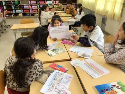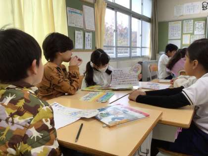 3年生の国語の様子です。本の魅力を伝えるポップが完成したので、グループごとに発表をしました。互いのポップのよいところも伝え合いました。その後、完成したポップと本を全校児童に見てもらえるように図書室に置きにいきました。みんなが読んでくれるとうれしいね。
