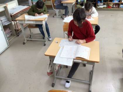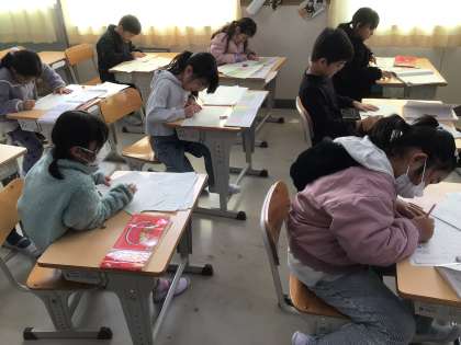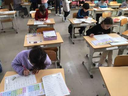 2年生の国語の様子です。漢字名人になろうと、みんな、たくさんのプリントに挑戦しました。1枚でも多く取り組めるように、一生懸命がんばりました。