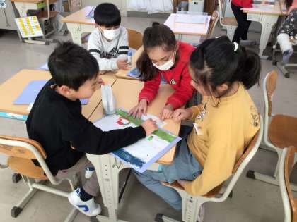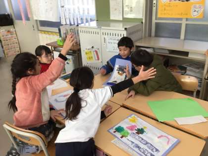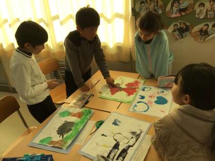 2年生の図工の様子です。スポンジでペタペタ、ローラーでコロコロして表現した絵の鑑賞会をグループごとに行いました。互いの絵について感想を伝えたり、質問し合ったりました。