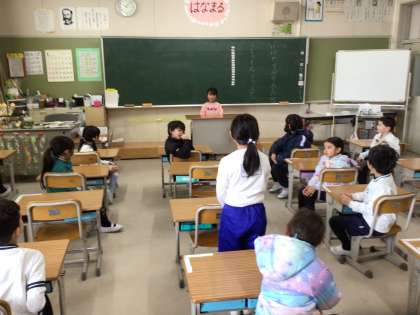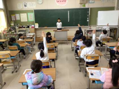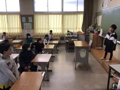 1年生の国語の様子です。冬休みの思い出を順番に話しました。話を聞いて、質問したり、感想を伝えたりしました。