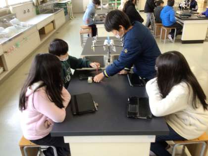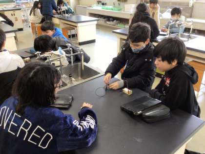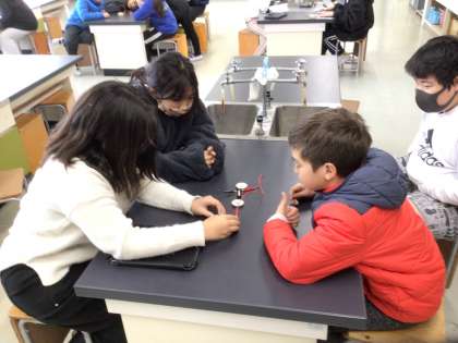 5年生の理科の様子です。電磁石の学習をしています。電磁石のN極とS極について方位磁針を使って調べました。