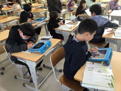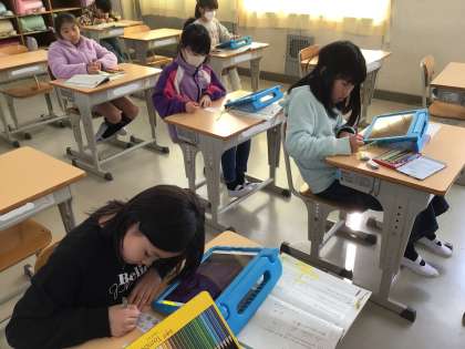 3年生の国語の様子です。俳句についての学習をしています。教科書にあるいくつかの俳句の中で気に入ったものをしおりに書き、その俳句を絵でも表現しました。