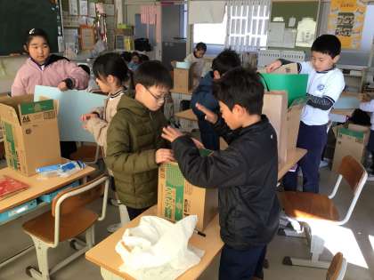 2年生の生活の様子です。動くおもちゃづくりの準備を始めています。グループごとに持ち寄った材料等を確認し、グループごとに材料を段ボールにまとめました。