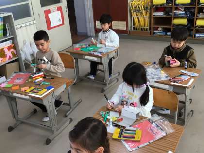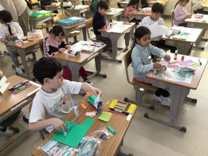 1年生の図工の様子です。紐の下をビューンと動くものを作っています。動くものの形を決め、それに折り紙などで飾りつけをしています。どんな動くものができるのか楽しみです。