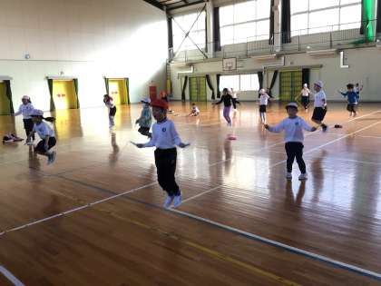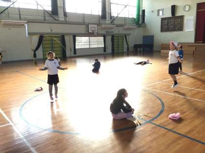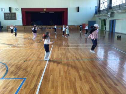 2年生の体育の様子です。体育館中を走り回ったり、縄跳びをいろいろな跳び方で跳んだりして、思い切り身体を動かしました。