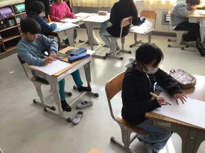 4年1組の図工の様子です。版画の下絵を版木に写したり、彫刻刀の使い方を学んだりしました。三角刀、小丸刀、丸刀で掘る練習をしました。