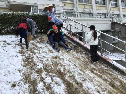 4組・5組・6組の体育の様子です。グラウンドの斜面を何回ものぼって段ボールで滑るなど、雪遊びを楽しみながらたくさん体を動かしました。