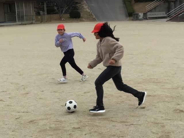 4年生の体育の様子です。オフェンス3人対ディフェンス2人でボールを奪い合いました。ボールをディフェンスに奪われず、シュートを決めるオフェンスのチームもありました。