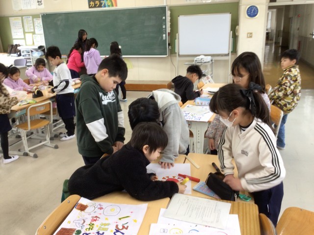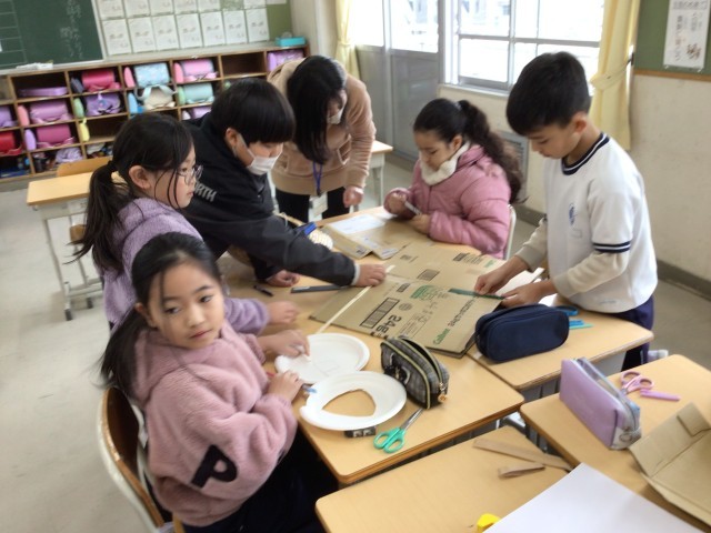 3年生の総合の様子です。学習発表会の発表に使う道具を同じグループの仲間と相談しながら作成しています。伝わりやすい発表を目指してがんばっています。
