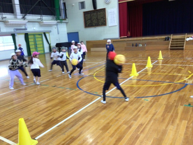 2年生の体育の様子です。大縄跳びで、2人同時に跳んだり、3人同時に跳んだりしました。その後、みんなでドッジボールを楽しみました。