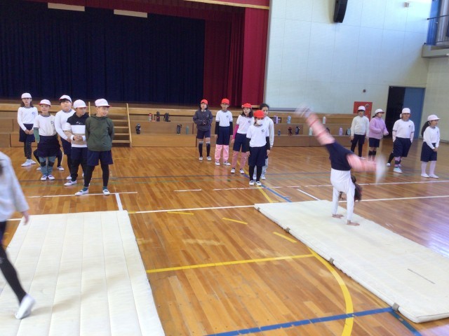 3年生の体育の様子です。開脚前転、開脚後転の練習をしました。互いのよいところを伝えたり、アドバイスをしたりしました。その後、側転にも挑戦しました。