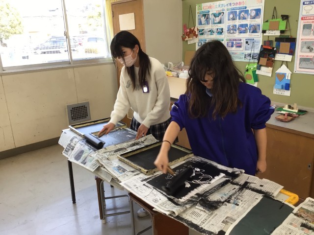 6年1組の図工の様子です。版画の刷りの作業を進めたり、色付けをしたりするなど、作品が完成に近づいてきています。