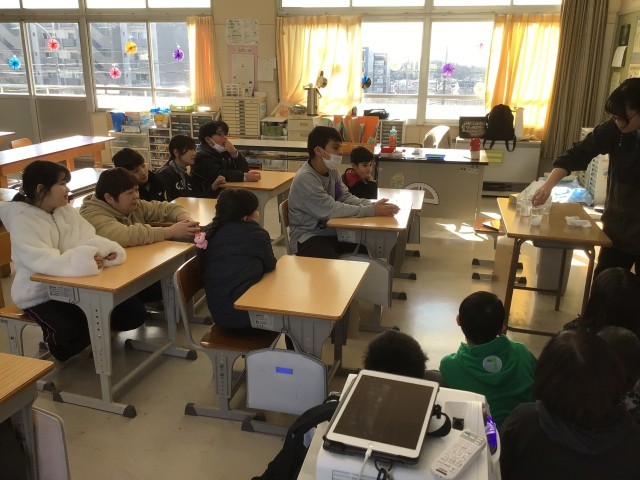 4組・5組・6組の理科の様子です。魔法の粉で魔法の水をつくる実験をしました。クエン酸に重曹を混ぜて、炭酸ガスの泡が出る様子を見ました。「ほみカフェ」でつくった「おにまんじゅう」にもこの粉が関係していることも知りました。