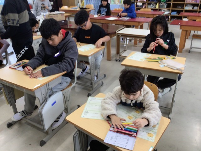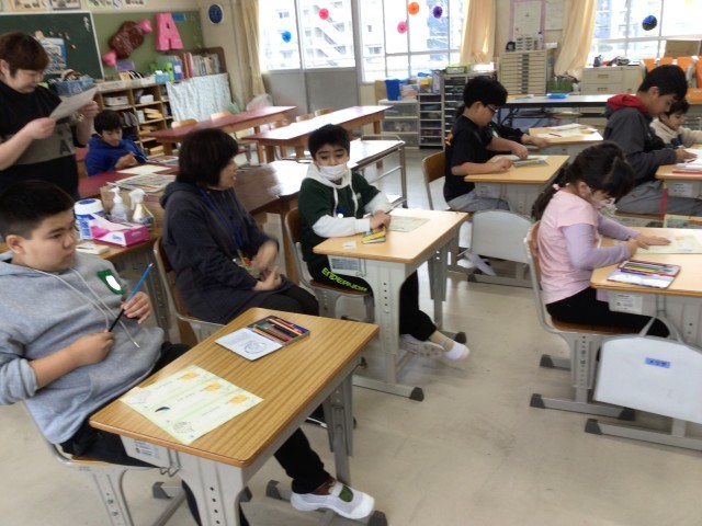 4組・5組・6組の授業の様子です。3月に実施する「にしほみマルシェ」の準備をしています。マルシェで使用するレシートづくりをしています。一つ一つ丁寧に色塗りできるようにがんばっています。
