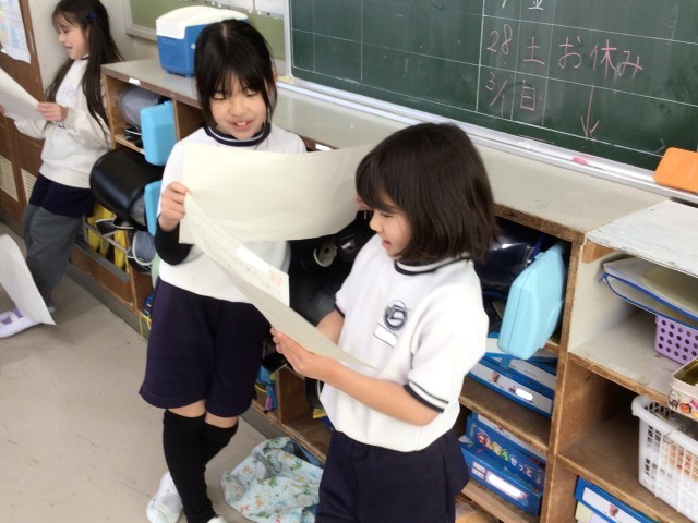 2年生の国語の様子です。「たからものをしょうかいしよう」という学習をしています。自分の宝物について説明する文章を書き、みんなに紹介するための練習をしています。