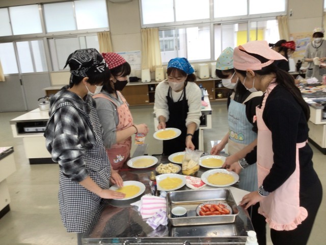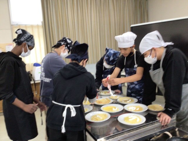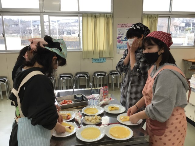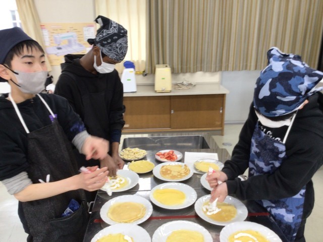 6年2組の家庭科の様子です。クレープづくりをしました。食べ始める頃合いを見計らっていきましたが、どのグループも手際よくクレープを完成させたので、食べているときの写真が撮れませんでした。
