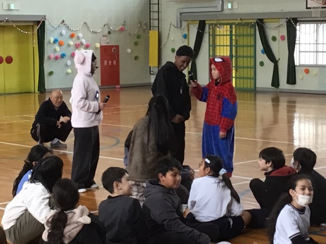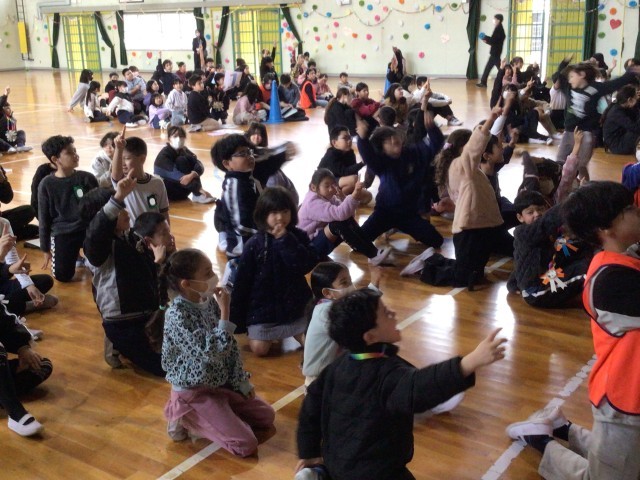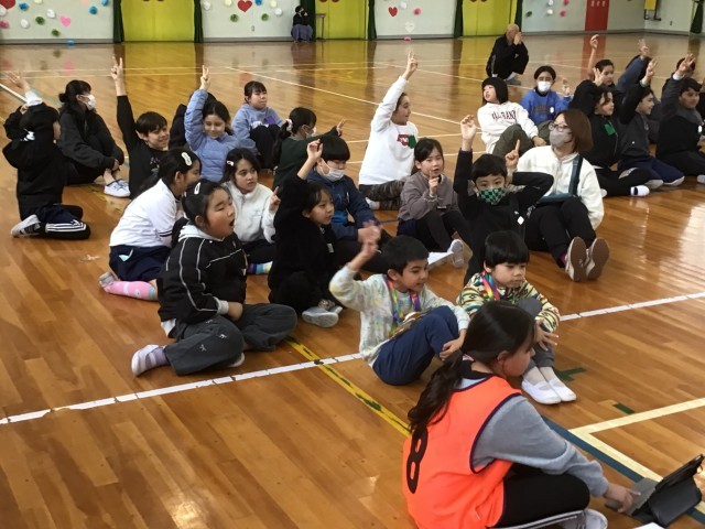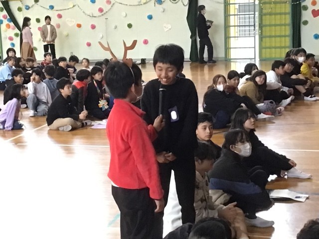 クイズ大会の様子です。6年生に関するクイズが出題され、一人一人が回答し、最も多い答えを班の回答として答えていきました。途中、6年生へのインタビューもあり、とても盛り上がりました。