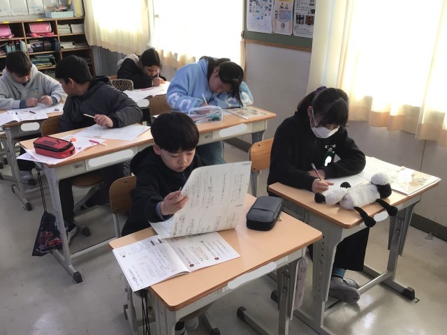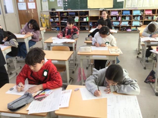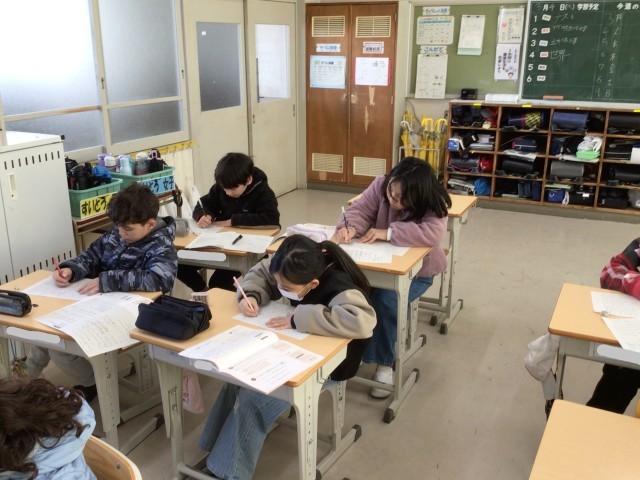 4年2組の書写の様子です。硬筆に取り組んでいます。きれいな字で書くことを意識し、丁寧に一文字ずつ集中して書くことができています。