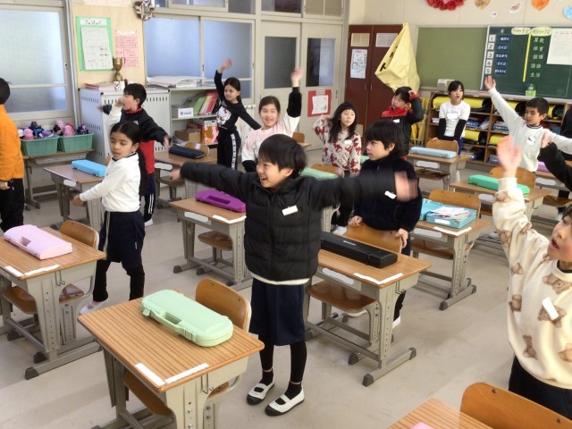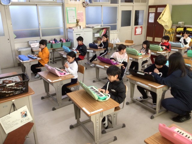 1年生の音楽の様子です。いろいろな歌を動作付きで歌ったり、「とんくるりん