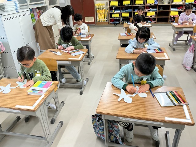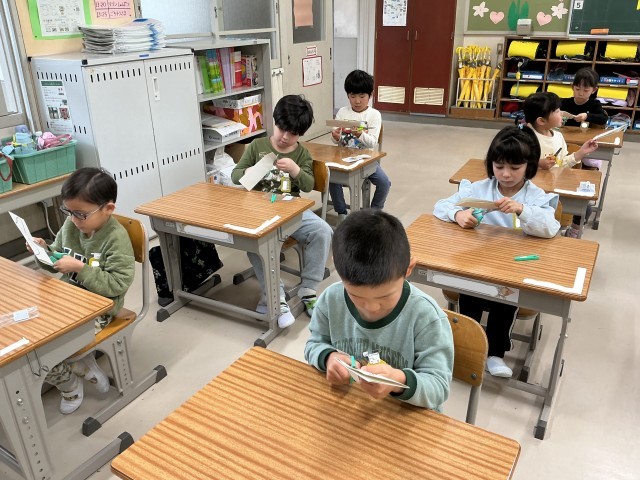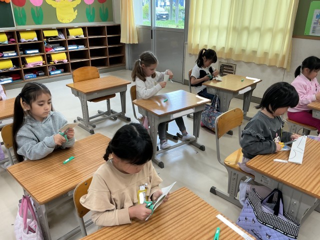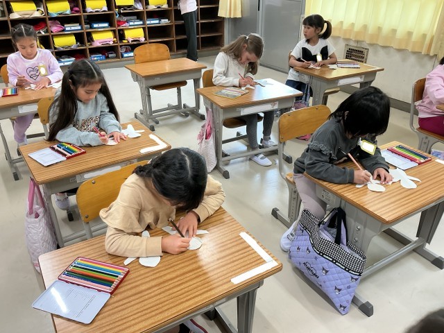 1年生の図工の様子です。紙を指示されたように切って、二人の人が手をつないだ形をつくりました。できた二人の形に自分と友達を色鉛筆で描きました。
