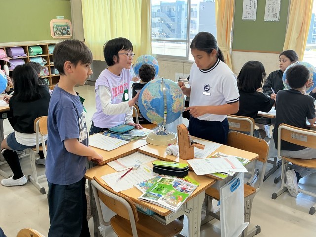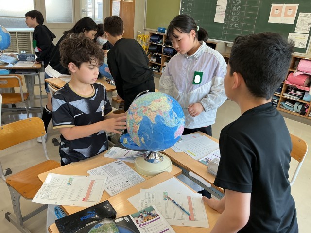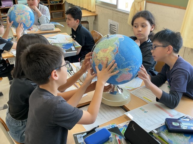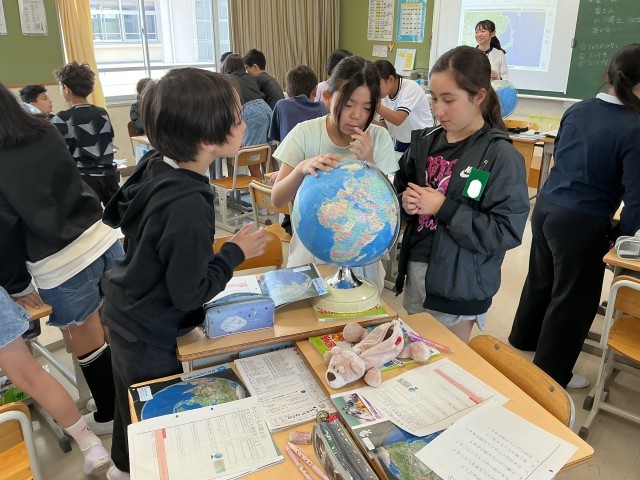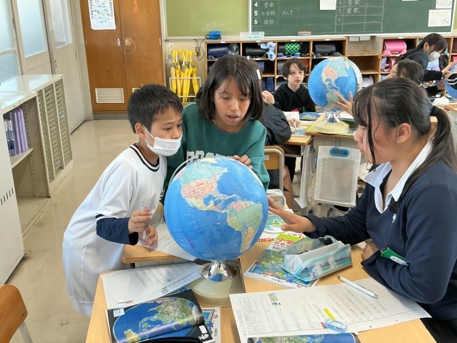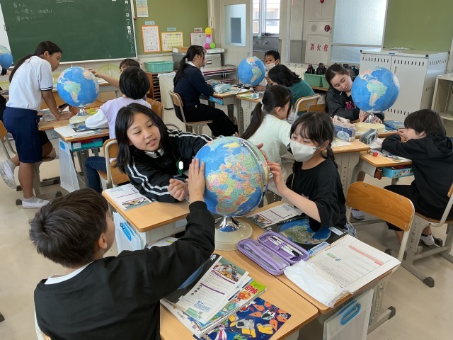 5年2組の社会の様子です。「わたしたちの国土」の学習をしています。地球儀を使って、日本の位置を確認しました。国名探しクイズも楽しみました。