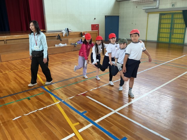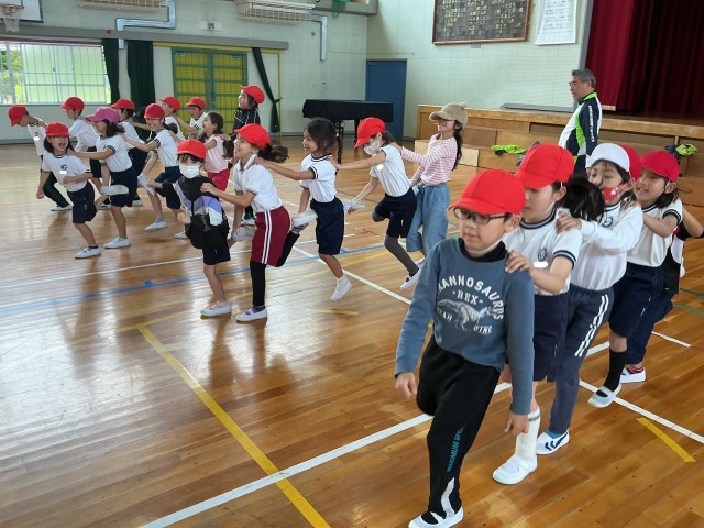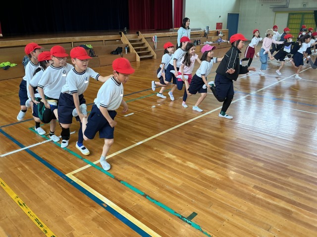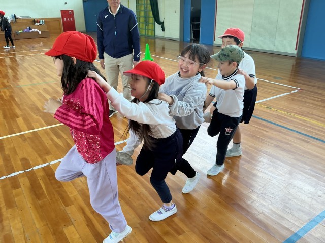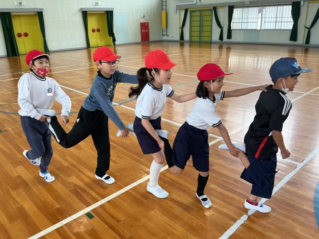 3年生の体育の様子です。「人つなぎ片足」というゲームに取り組んでいます。5人で順番を工夫しながら協力して取り組んでいます。授業の最後に競争も楽しみました。