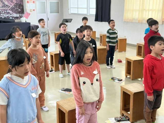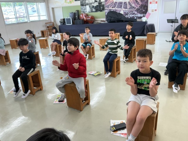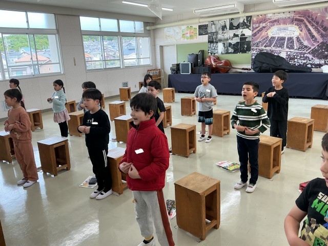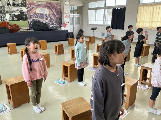2年生の音楽の様子です。視力検査後の授業でいつもよりも短い時間でしたが、「あくびの歌」などを元気よく歌ったり、リズムトレーニングを楽しんだりしました。