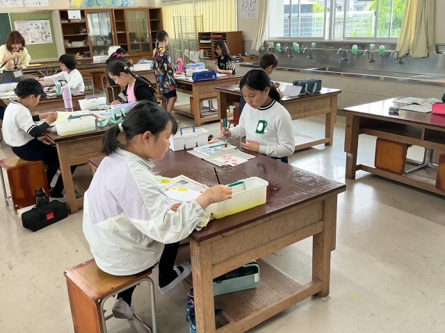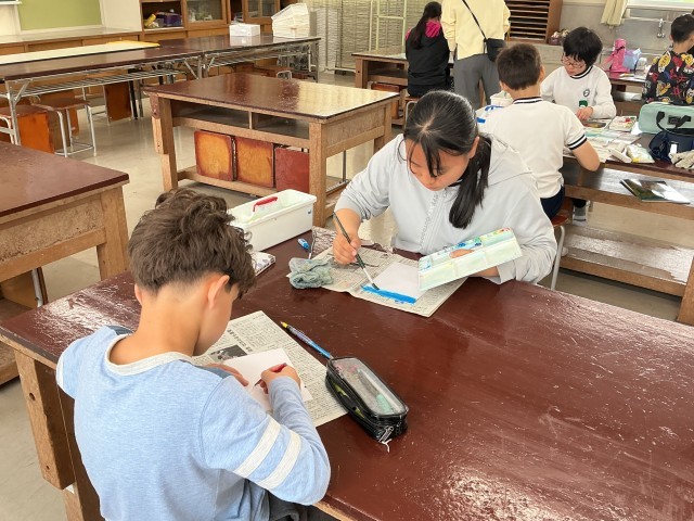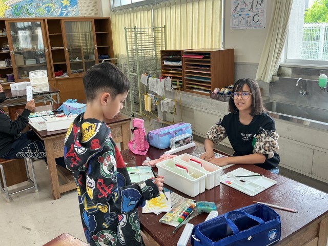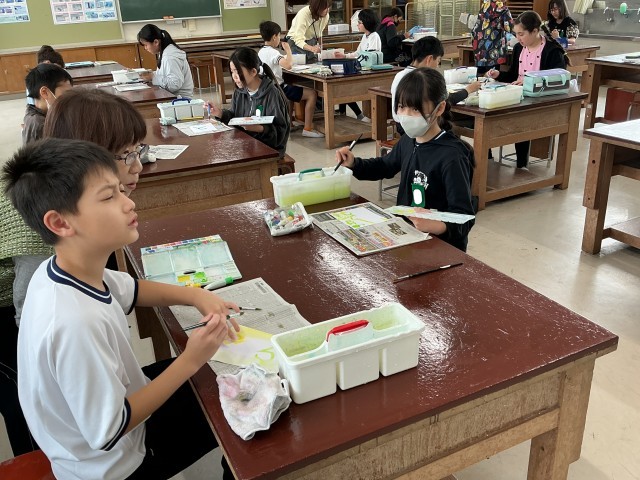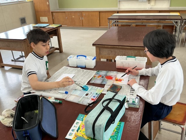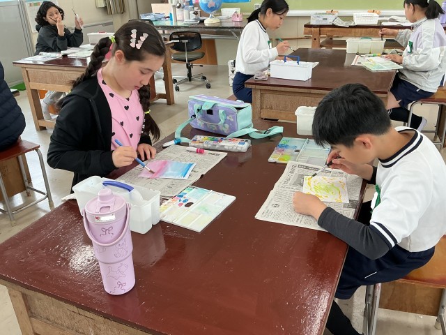 授業の様子【5年生】から(4月22日) 公開日 2026/04/22 更新日 2026/04/22 お知らせ 5年2組の図工の様子です。「心の模様」を表現しました。「うれしい」「悲しい」などの気持ちを色で表現すると何色になるのか等について考えた後、各自で自分の気持ちを色や形で表してみました。「にじみ」や「ぼかし」等の技法も使いながら、それぞれの心の模様を描くことができました。 +4