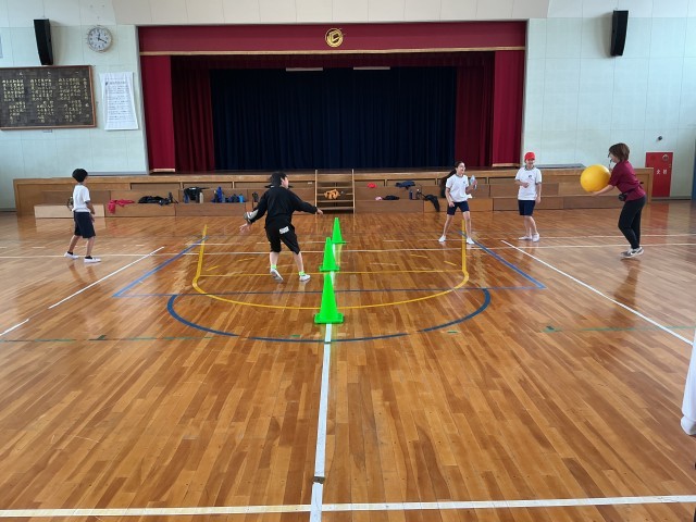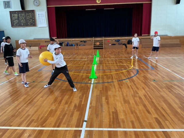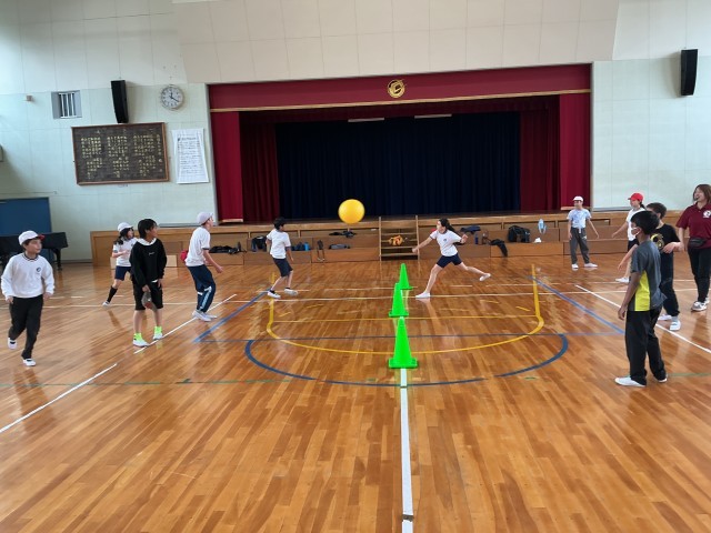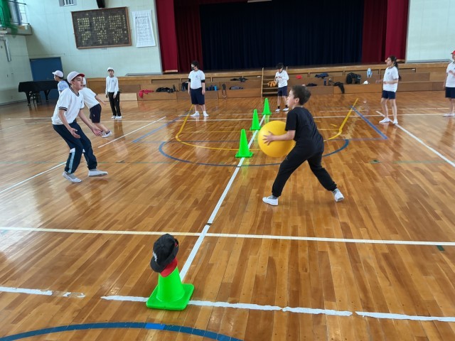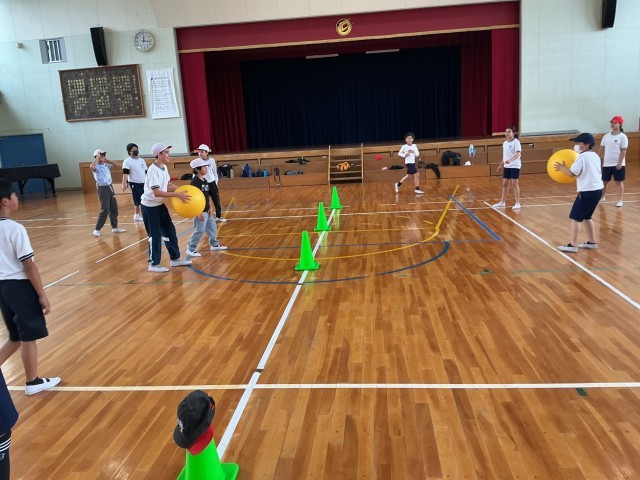 6年生の体育の様子です。2つの大きなボールでドッヂボールを楽しみました。最後の試合は、担任の先生も入って白熱した戦いになりました。