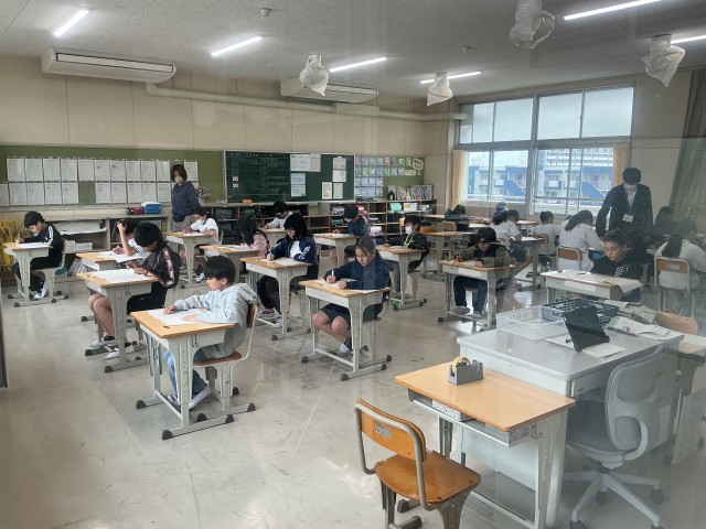 6年生の全国学力・学習状況調査(算数)の様子です。窓越しではありますが、みんな、真剣に問題に取り組んでいる様子が見られました。