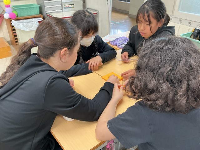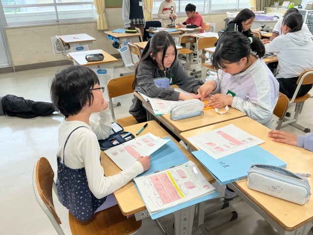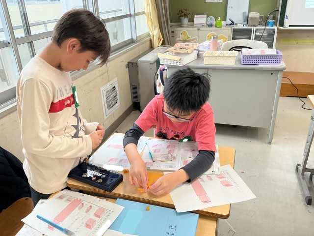 5年2組の算数の様子です。体積を求める公式について、グループで2つの形をブロックで作りながら考えています。ブロックを活用して学習したことで、公式を導き出せそうです。