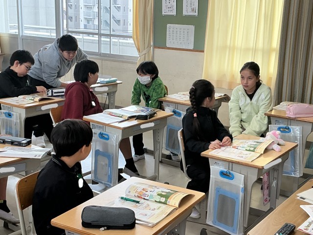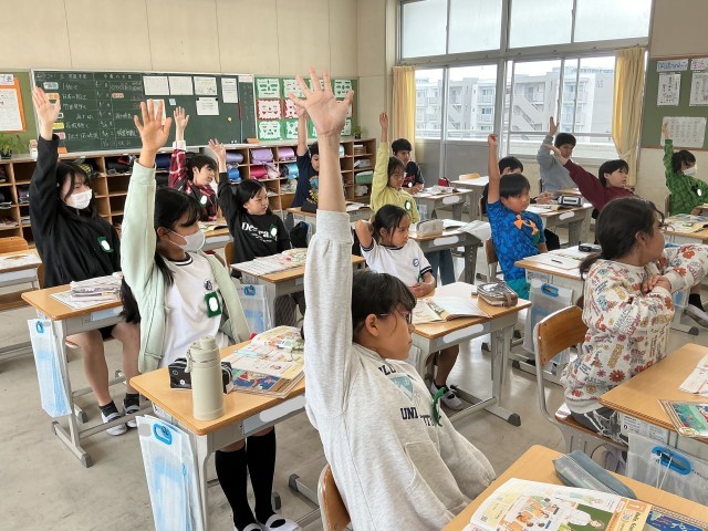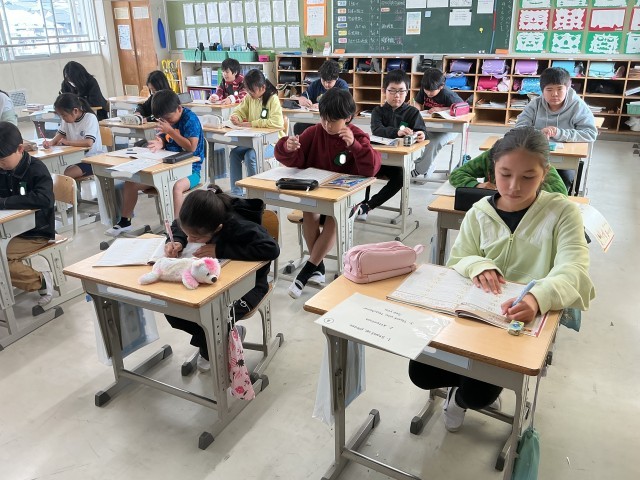 5年1組の外国語の様子です。アルファベットを発音したり書いたりしました。その後、さまざまな映像を見て、会話の内容で分かったことを周りの子と伝え合ったり、発表したりしました。