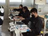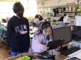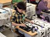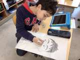 図工の時間、版画の下絵に取り組んでいました。学習用タブレットで自分の顔を写し、眉...